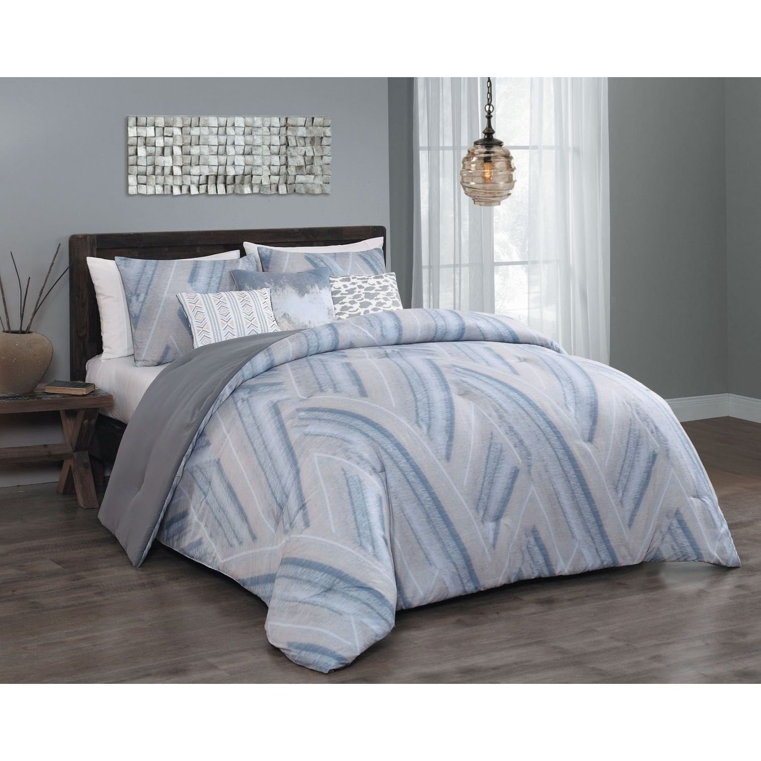 - Includes comforter, 2 shams, and 3 decorative pillows